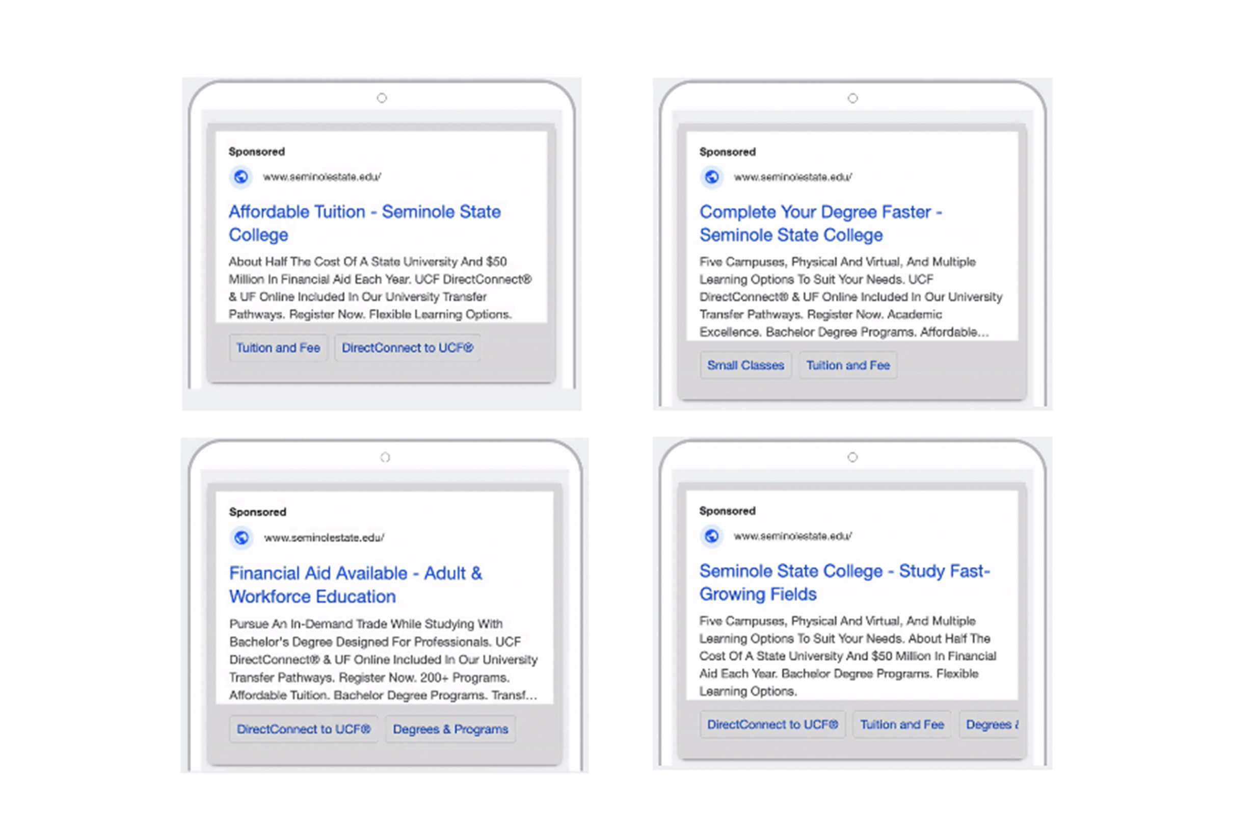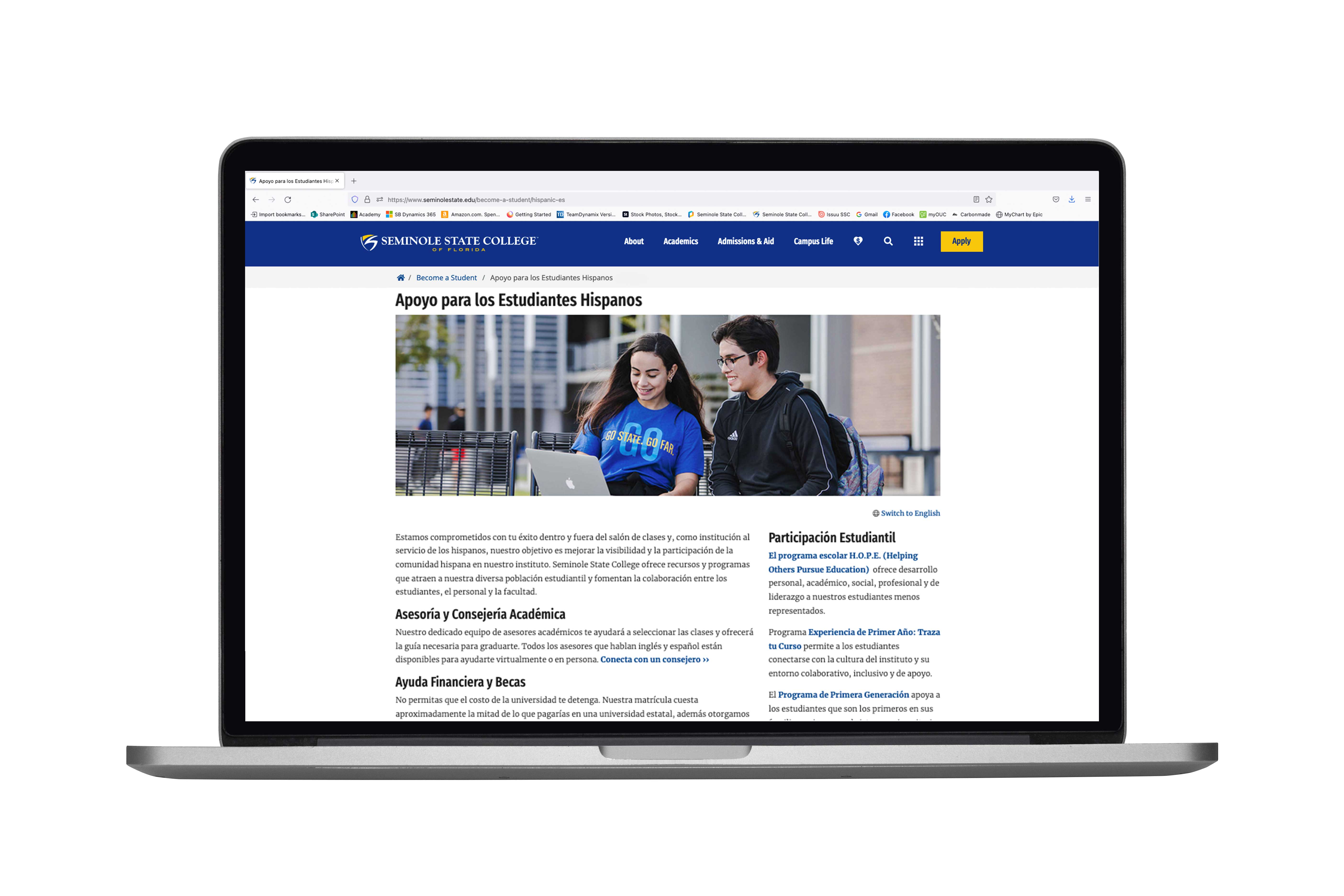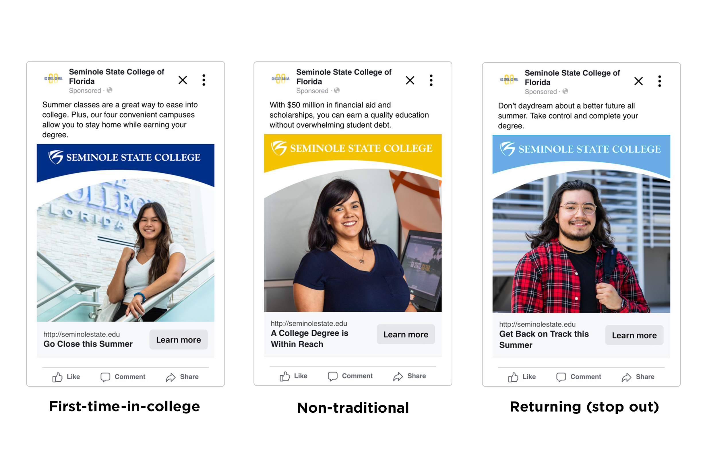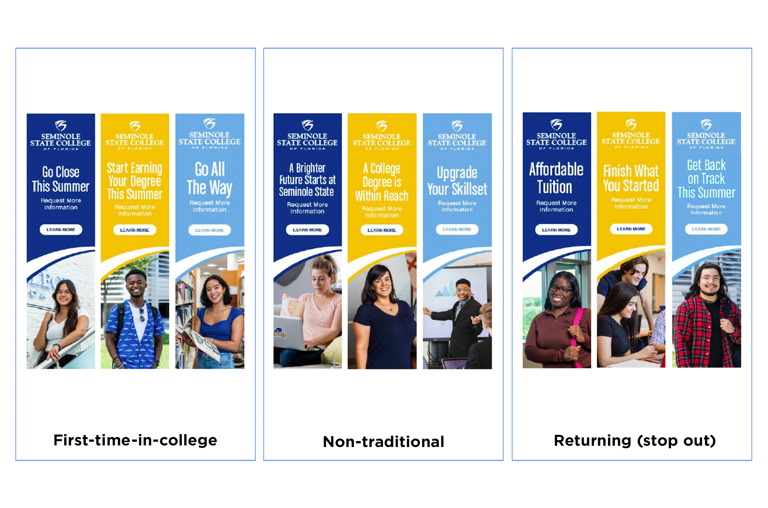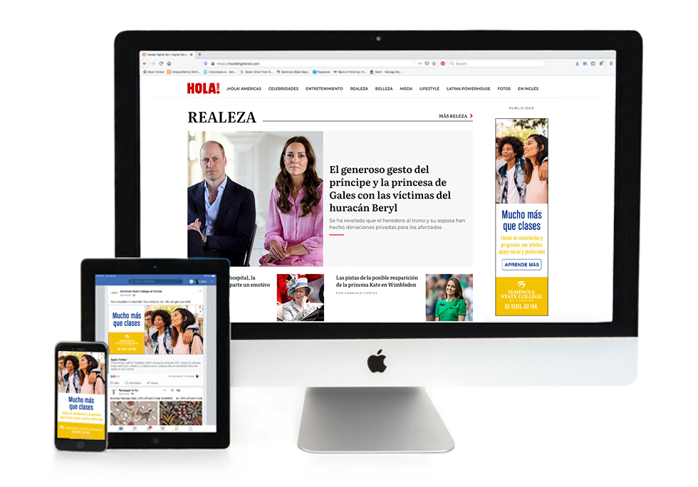 Seminole State College of Florida is recognized as a Hispanic-Serving Institution (HSI) by the Hispanic Association of Colleges and Universities (HACU), with the college’s Hispanic enrollment at 25% of its total enrollment. Prospective students from Hispanic families value support from their familial influencers, such as parents, aunts/uncles or grandparents who may speak Spanish as their first language. It is imperative that we offer marketing to these families in their native language, so they may assist in decisions regarding higher education. We target users in our Hispanic communities with programmatic display, OOH digital boards, and YouTube videos in Spanish.