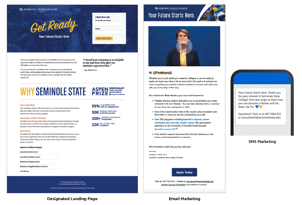 RESULTS: Between July 2024 and June 2025, the RFI digital campaign garnered 6.5 million impressions, drove 26K landing page views (sessions on seminolestate.edu), 113K clicks at $.63 cost-per-click (CPC) and 1.7% click-through rate (CTR), and accounted for 5,103 RFI leads at $14.08 cost per lead. The campaign also delivered over 800 admission application submissions – exceeding both 2025 industry benchmarks across all available metrics and showing growth over last year (increased 7.1% YOY from FY24-25).