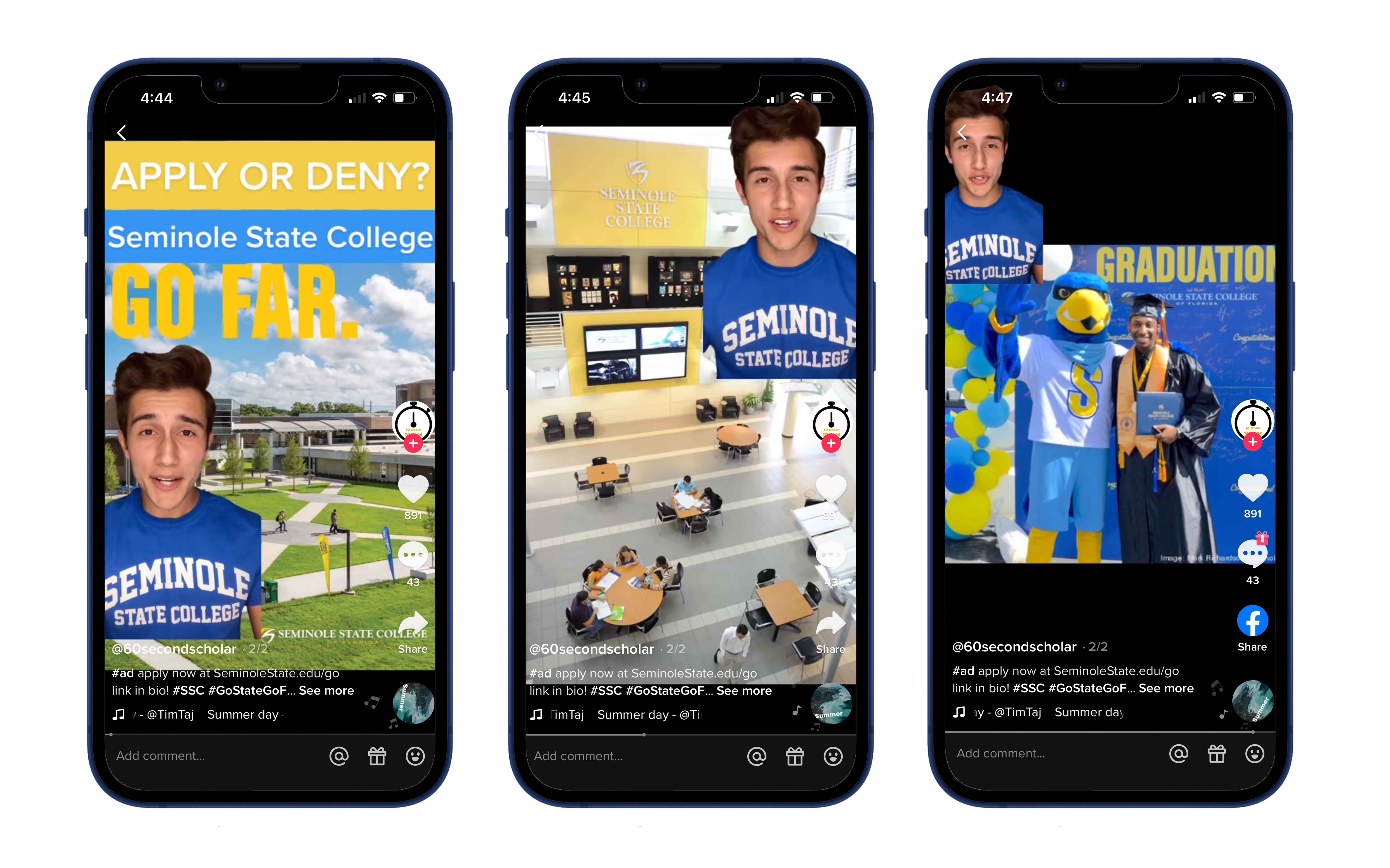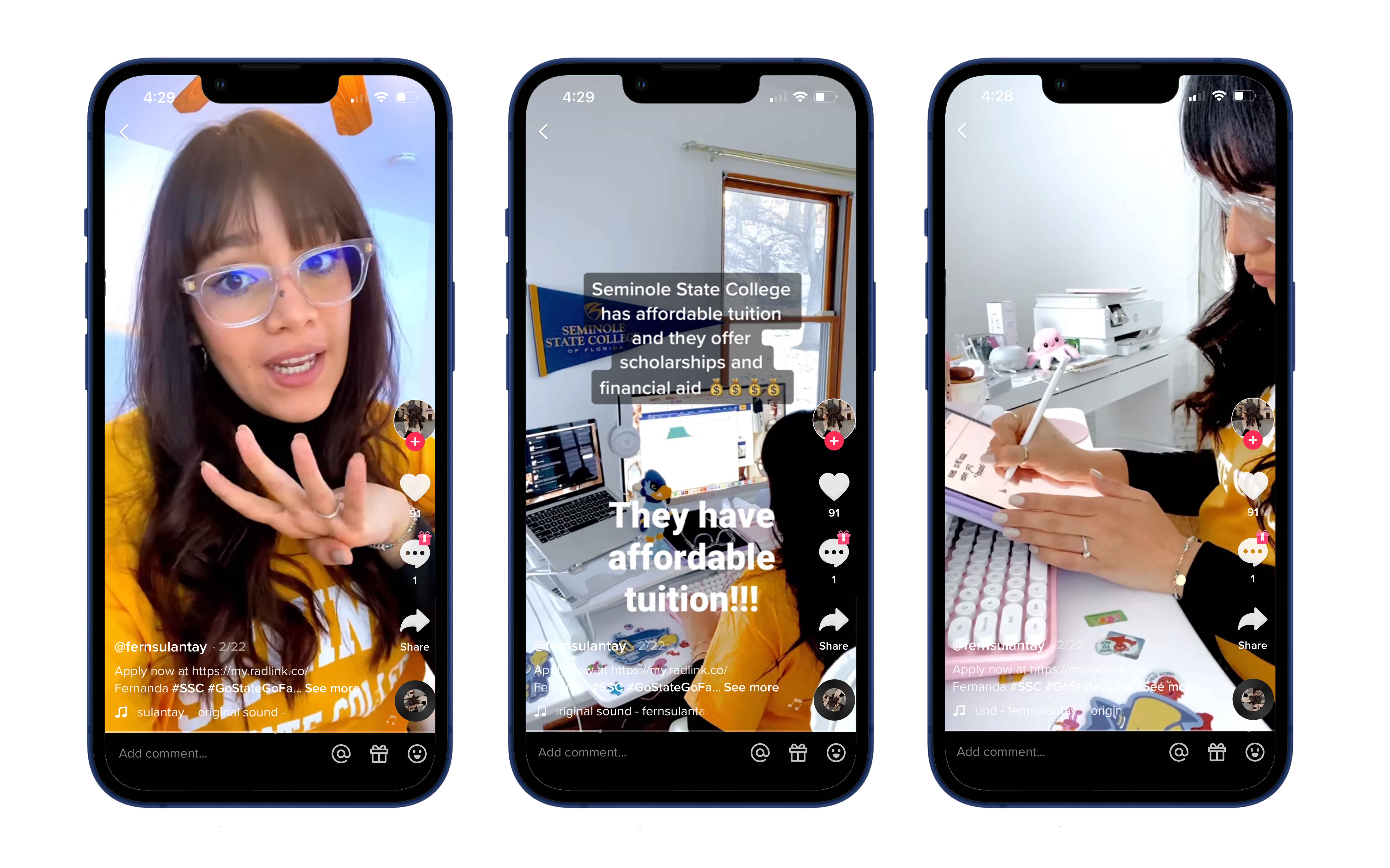 I facilitated collaboration with paid social media influencers, Fernanda (@fernsulantay) and Zavier (@60secondscholar) to develop content creation for Seminole State College, providing a creative brief (college fast facts, key messaging, campus photos, and campaign goals) and selecting personalities for each campaign. Influencers created their own content including approved messaging and branded apparel/promo items.