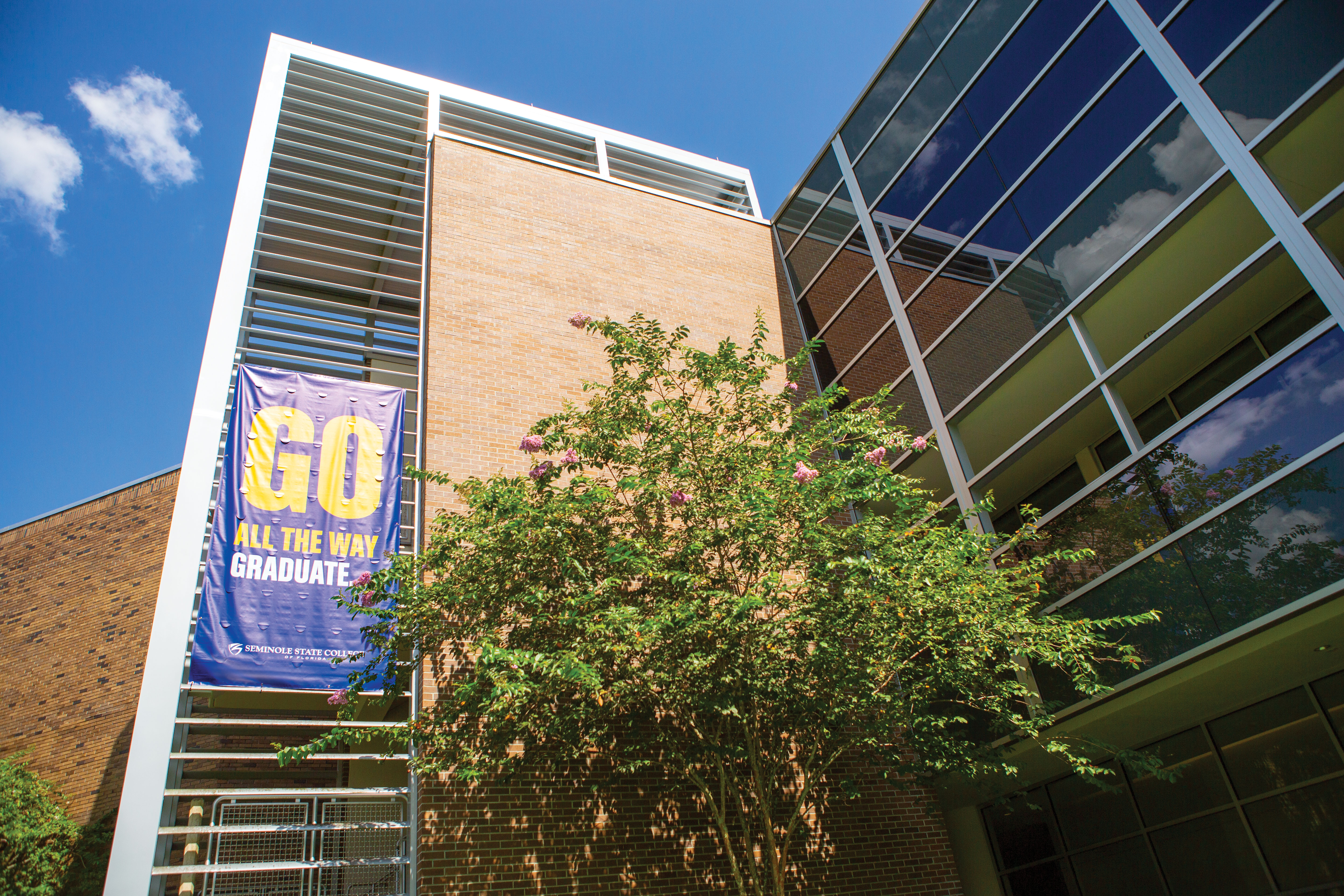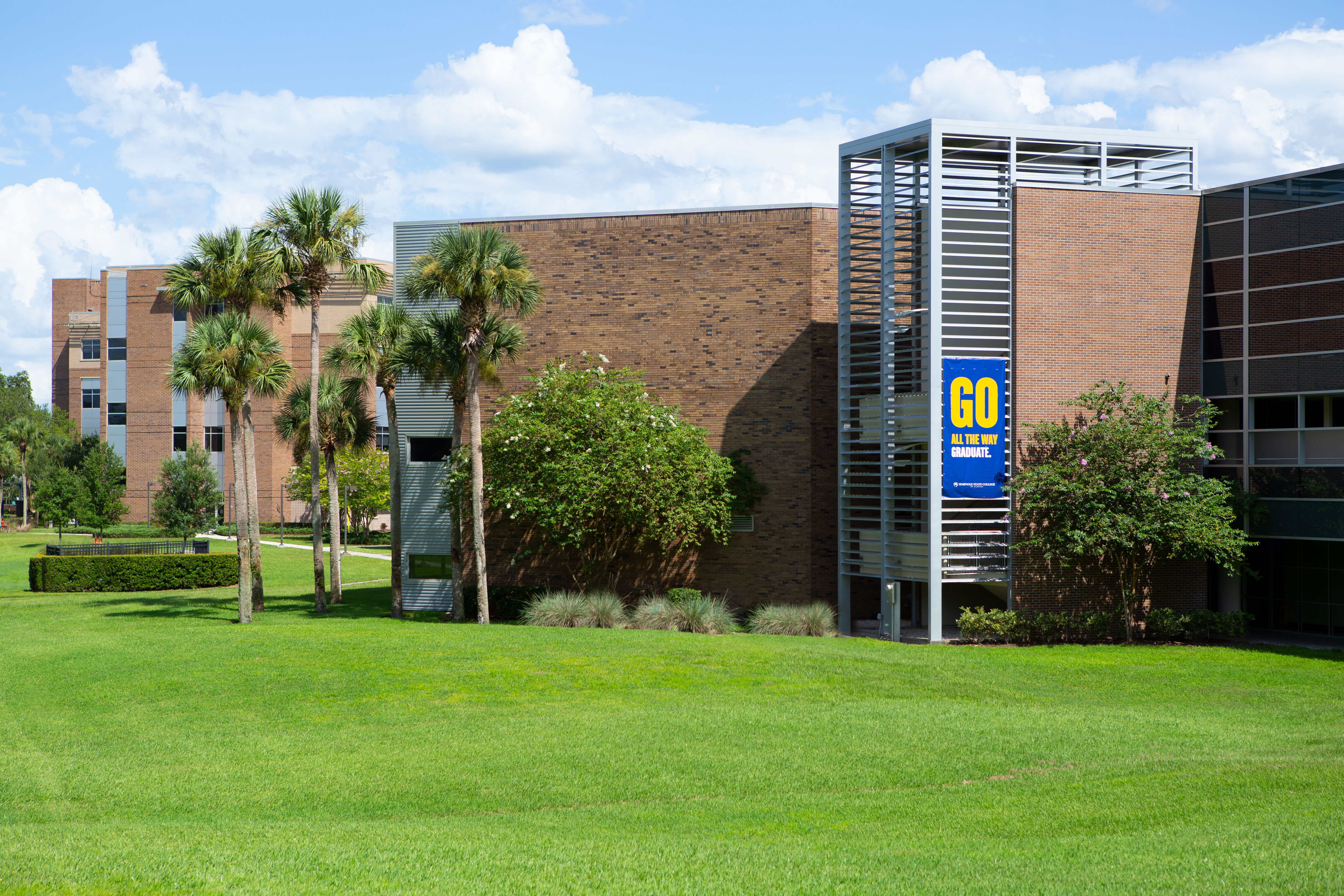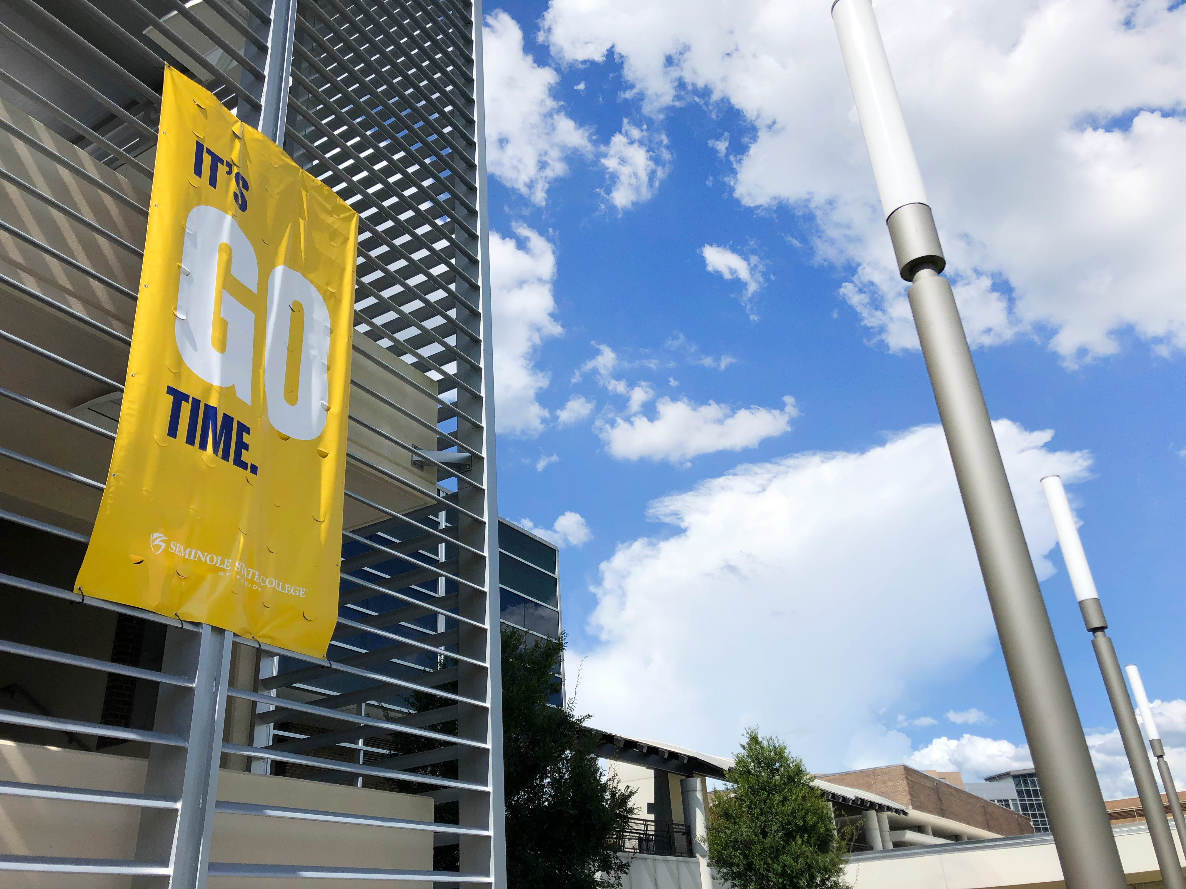 Multiple large format banners were designed for display during the first few weeks of Fall Term at Seminole State College to welcome students back on to campus. These 6'x15' branded banners were consistent with current campaign messaging and were installed on centralized campus buildings with the most surrounding foot traffic.